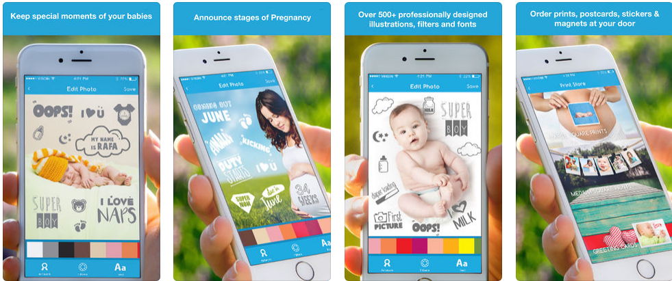 This is an app which helps to keep special moments of your babies, announce stages of pregnancy, order prints, postcards, stickers, and magnet at your door and share customized photos with family